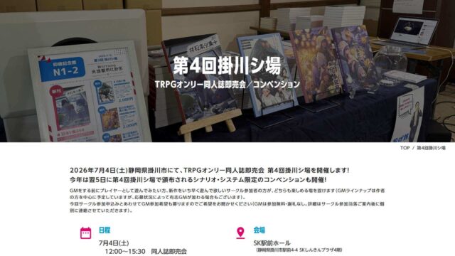 静岡県掛川市にて、テーブルトークRPGオンリー同人誌即売会「第3回掛川シ場」が開催される。開催日時は2025年7月5日13時開場、16時30分閉場。会場は静岡県掛川市の大日本報徳社大講堂および仰徳記念館で、入場料は無料(投げ銭式・100円から)。また、翌7月6日には天竜浜名湖鉄道の列車を貸し切ったテーブルトークRPGセッションが予定されており、こちらは事前予約制となっている。