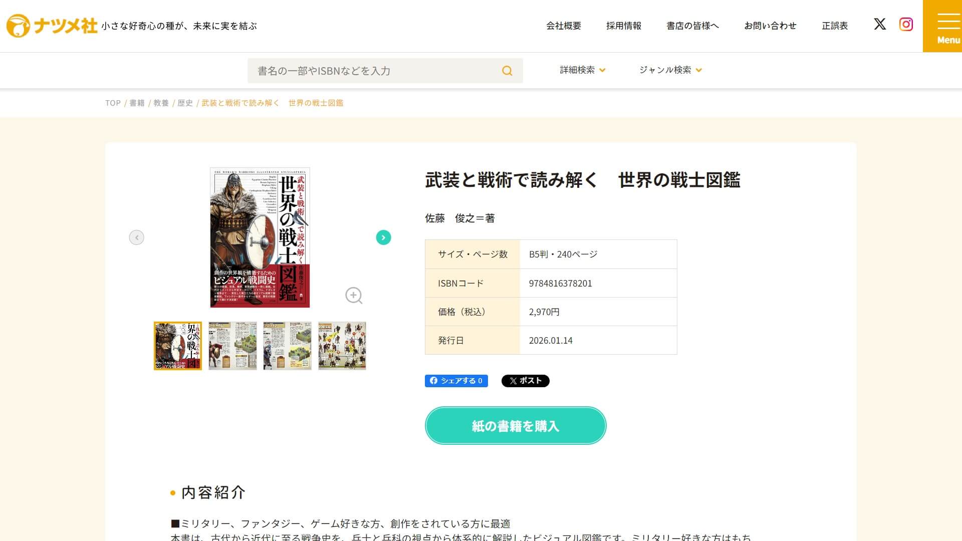 ナツメ社は、歴史著述家・佐藤俊之氏による「武装と戦術で読み解く 世界の戦士図鑑」を2026年1月14日に発売した。B5判・240ページ、価格は税込2,970円。