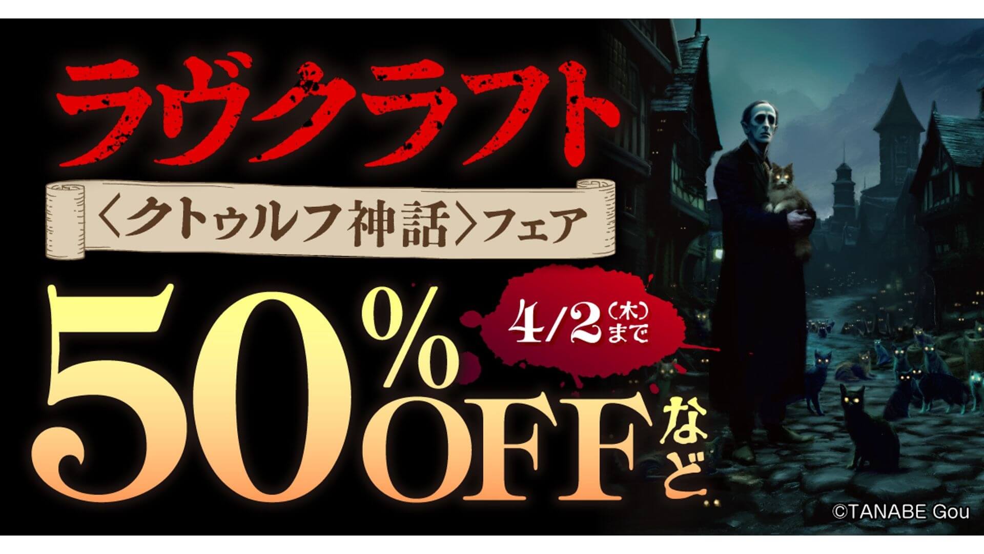 割引対象となるのは「魔犬 ラヴクラフト傑作集」「狂気の山脈にて ラヴクラフト傑作集」(全4巻)「クトゥルフの呼び声 ラヴクラフト傑作集」「ダニッチの怪 ラヴクラフト傑作集」(全3巻)など、田辺剛のコミック作品を中心とした複数のシリーズ。Amazon Kindleストア、BOOK☆WALKER、紀伊國屋書店Kinoppy、ブックライブ、honto、Google Play ブックス、Apple Booksなど、24の電子書籍ストアで実施される。