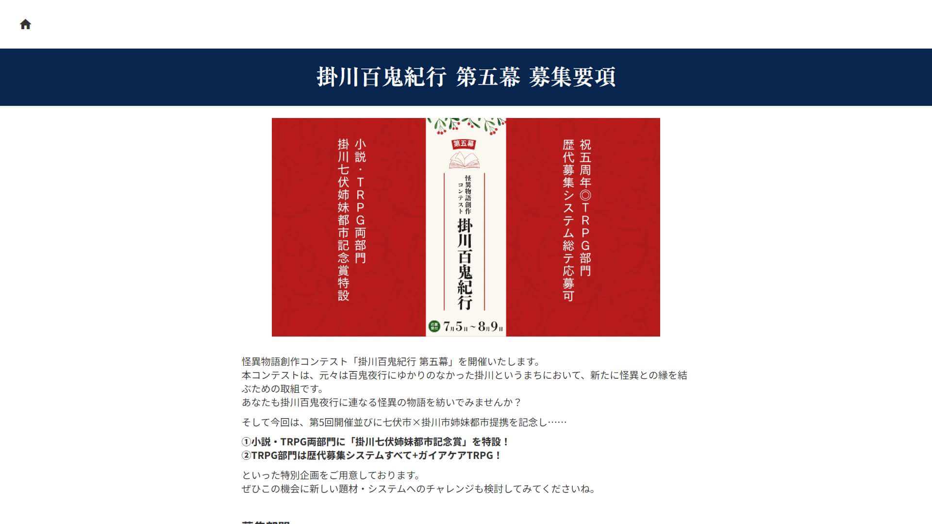 静岡県掛川市のイベント「掛川百鬼夜行」に合わせた怪異物語創作コンテスト「掛川百鬼紀行 第五幕」の募集要項が発表されている。応募受け付けは2026年7月5日20時から8月9日23時59分まで。