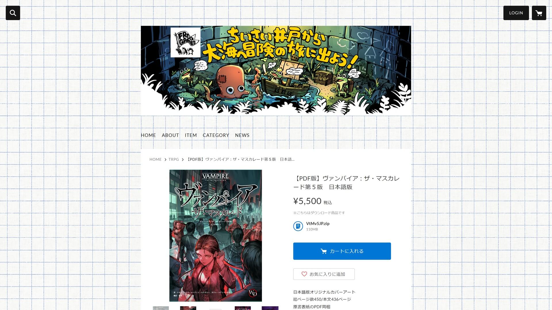 フロッグゲームズは、テーブルトークRPG「ヴァンパイア:ザ・マスカレード第5版」日本語版のPDF版の販売を開始した。フロッグゲームズのオンラインストア(STORES.jp)にてダウンロード購入できる。価格は税込5,500円。